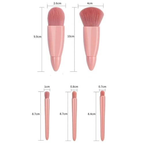 Kit com 5 pincéis de maquiagem essenciais para base, pó e sombra, com estojo compacto com espelho. Possui cerdas sintéticas macias, cabos ergonômicos e compartimentos organizados, ideal para levar na bolsa ou em viagens.